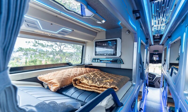 Điểm nổi bật của Long Vân chính là dàn xe limousine đời mới được trang bị giường nằm tích hợp massage, khoang hạng thương gia riêng tư với topper và chăn gối êm ái, cùng màn hình giải trí LED sắc nét. Ngoài ra, trên xe còn có wifi tốc độ cao, sạc không dây, khăn lạnh, nước suối tinh khiết và cả set ăn nhẹ độc quyền phục vụ khách hàng.