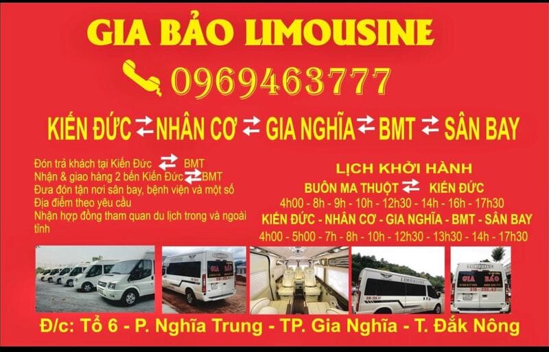 Nếu bạn đang tìm kiếm một hãng xe Limousine uy tín, phục vụ chu đáo trên tuyến Kiến Đức – Nhân Cơ – Gia Nghĩa – Đắk Song – Đắk Mil – Buôn Ma Thuột, thì Nhà xe Gia Bảo Đắk Nông chính là lựa chọn lý tưởng. Với hệ thống xe Limousine 9 chỗ cao cấp, trang bị đầy đủ tiện ích hiện đại như wifi, điều hòa, nước uống, ổ cắm sạc USB, cùng đội ngũ tài xế chuyên nghiệp, Gia Bảo mang đến trải nghiệm di chuyển an toàn, tiện nghi và đúng giờ cho mọi hành khách.