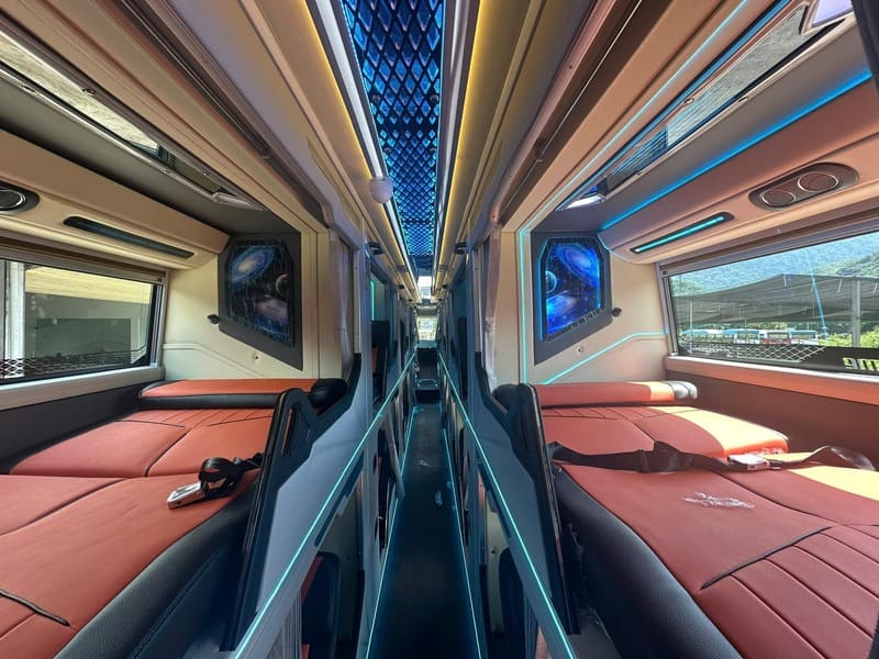 Toàn đội 22 giường phẳng đều là xe thân cao, sàn không gồ ghề, mỗi phòng nằm có rèm che riêng tư, đèn đọc sách, cổng USB & ổ điện 220 V.