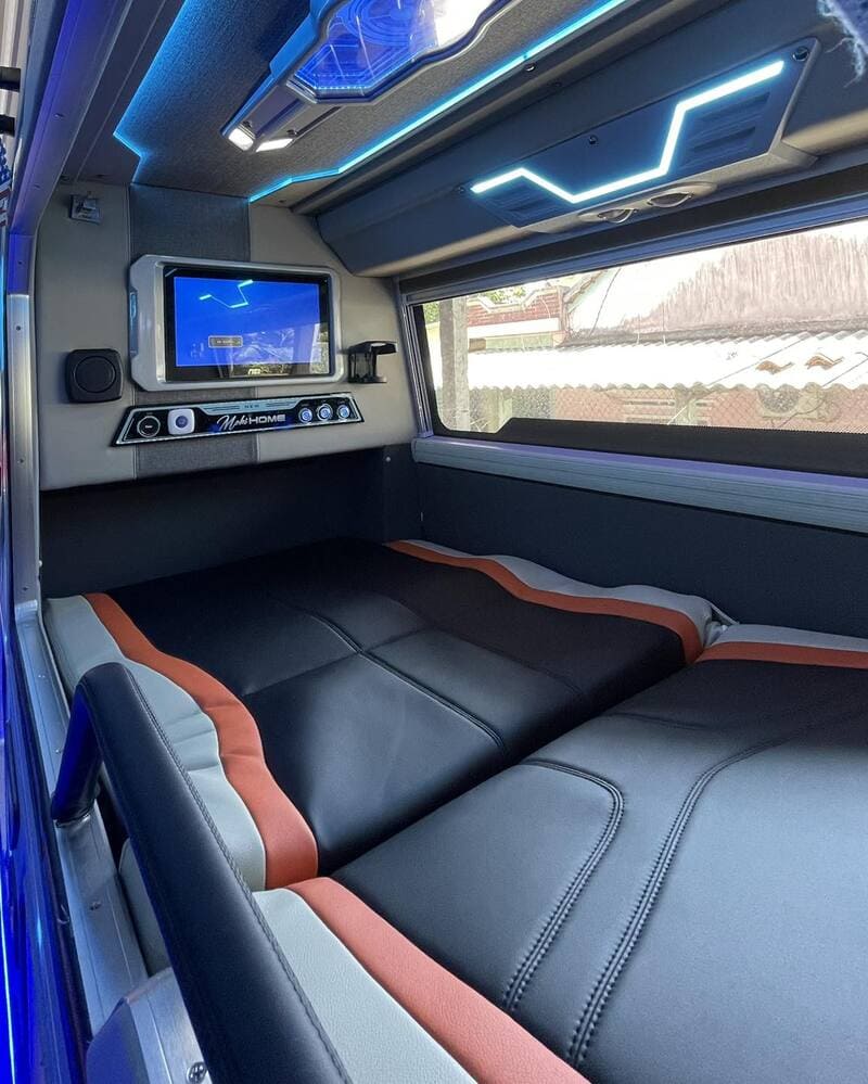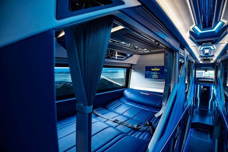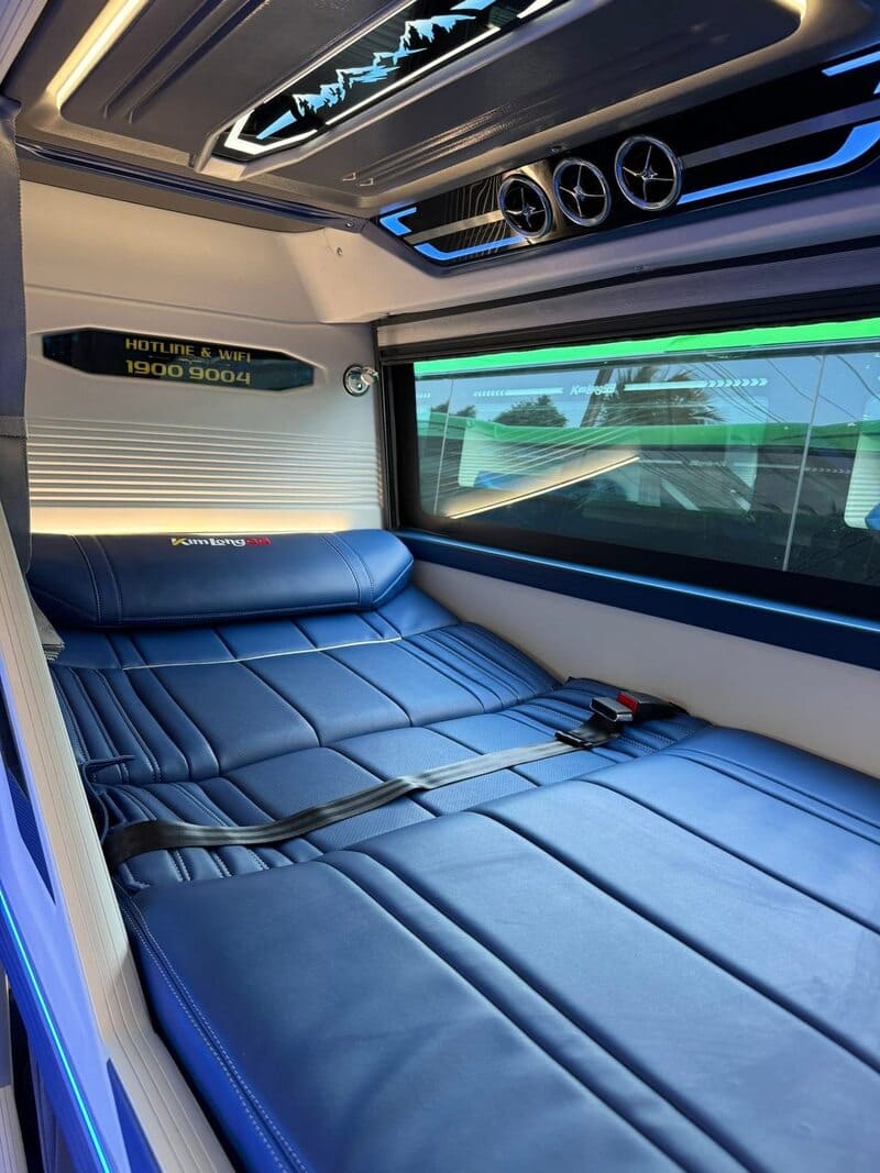 Không gian nghỉ ngơi được đầu tư tỉ mẫn với giường nằm bọc da cao cấp, mang đến độ êm ái vượt trội. Mỗi khoang hành khách được tách biệt bởi rèm riêng tư, tạo cảm giác thoải mái tuyệt đối.
